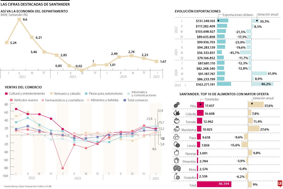 Santander ha venido recuperando su posición como uno de los departamentos con mayor dinamismo, representando 6,4% del PIB nacional y con un crecimiento de 1,8% en 2024, cifra que superó el promedio del país y el dato de departamentos más industrializados. Estas cifras han sido impulsadas especialmente por el fortalecimiento del agro, el comercio interno y las exportaciones.