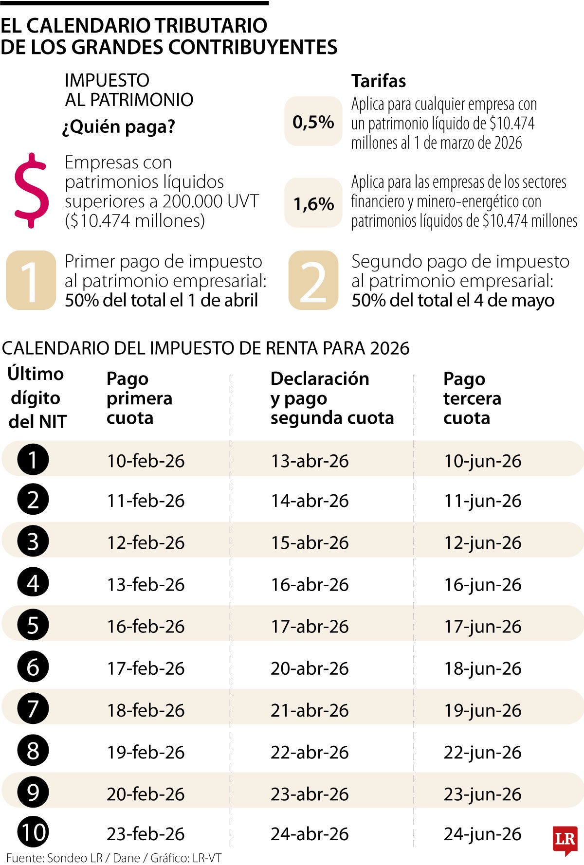 El pago de la primera cuota se realizó en febrero, entre el 10 y el 23 de ese mes, según el último dígito del Número de Identificación Tributaria, NIT. Posteriormente, entre el 13 y el 24 de abril, deberán presentar la declaración y pagar la segunda cuota. El proceso se completa en junio, cuando se paga la tercera cuota.
