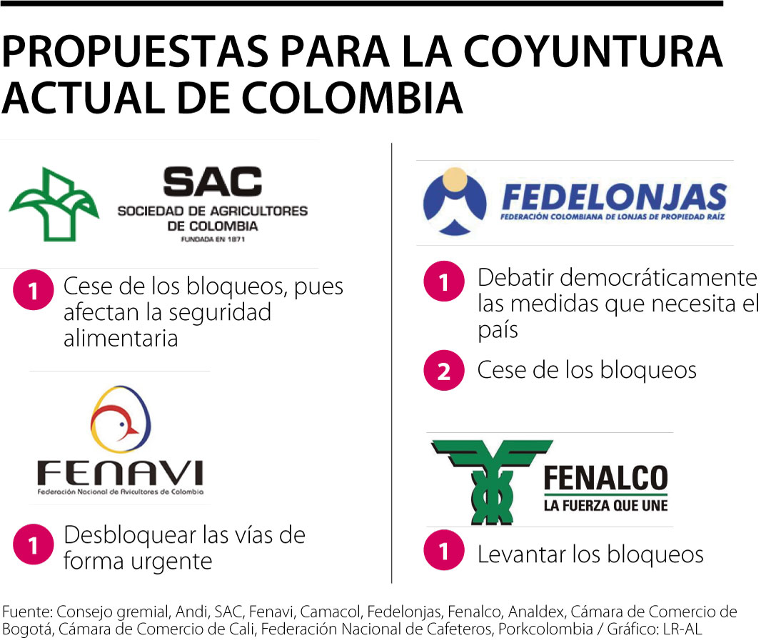 Varios gremios e instituciones académicas han hecho propuestas para poner fin al paro nacional, haciendo un llamado al cese de la violencia, los bloqueos, y al progreso de los diálogos entre el Gobierno Nacional y el Comité del Paro. Pero, además, han hecho especial énfasis en la importancia para sacar adelante una nueva reforma tributaria.
