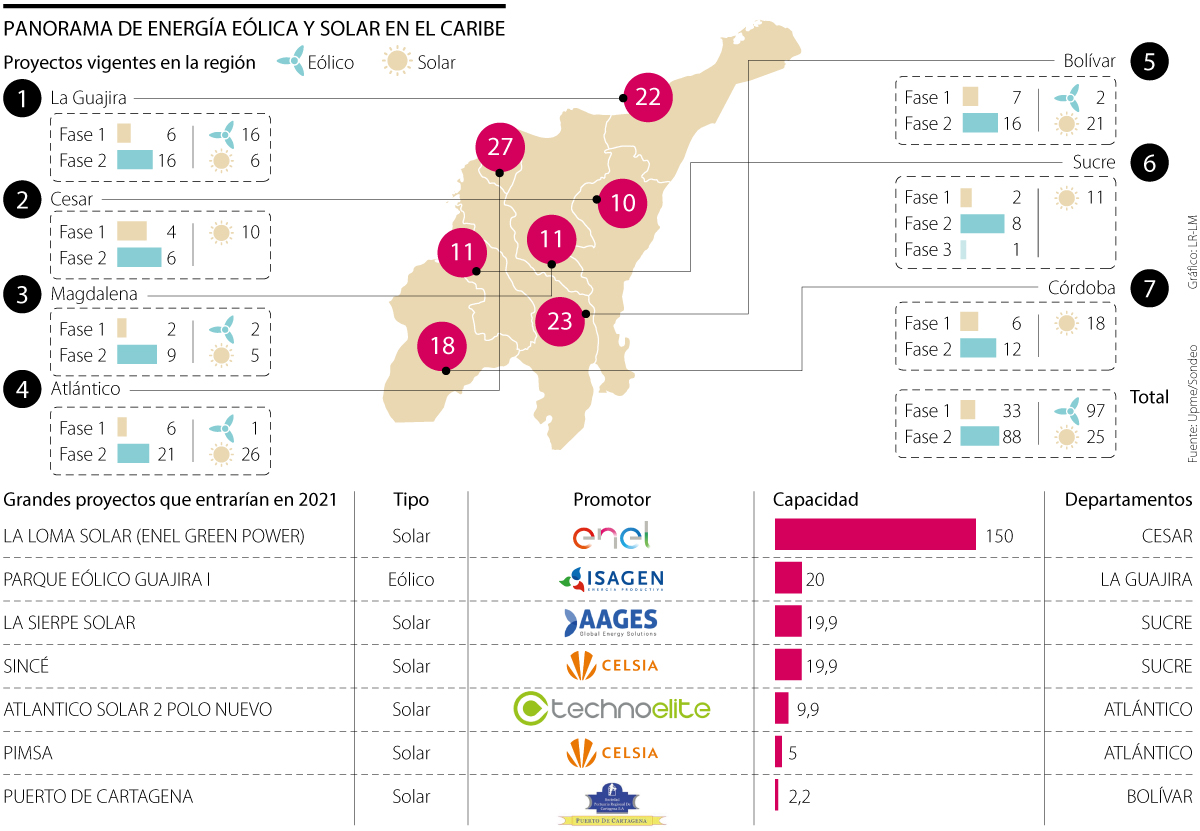 Hasta el momento en siete departamentos de la región hay 122 proyectos vigentes, su mayoría en Fase 2, según los registros de la Unidad de Planeación Minero Energética (Upme) y un 72% enfocado en desarrollos solares aprovechando el clima de los departamentos del Caribe, que tienen promedios de irradiación de entre 5 y 6,5 KWH/M2/día, superiores al promedio de Colombia, de 4,5 KWH.