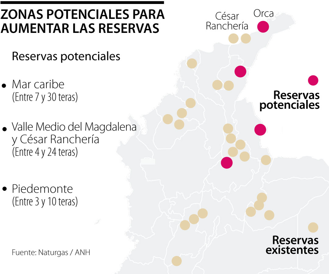 Ante el declive de las reservas de gas natural, Naturgas ha señalado que se debe seguir potencializando la producción local, que además de los pozos al interior del país y los no convencionales, puede llegar del potencial que hay en el Mar Caribe, donde hay entre 7 y 30 teras en yacimientos no convencionales, que multiplicaría por cinco las reservas actuales.