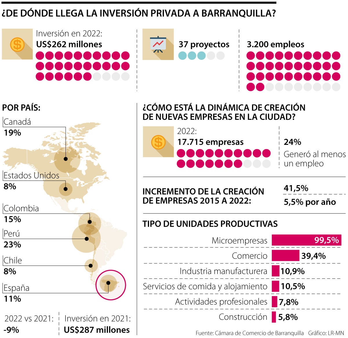 En 2022, Barranquilla atrajo inversiones por más de US$262 millones, representados en 37 proyectos que generaron más de 3.200 empleos. Aunque la cifra fue muy positiva, en realidad marcó una desaceleración de 9% respecto a lo reportado en 2021, cuando ingresaron a la ciudad US$287 millones, según indicó Manuel Fernández, presidente ejecutivo de la Cámara de Comercio de Barranquilla.