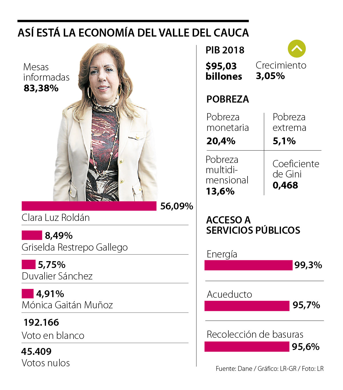 Si se comparara el total de la economía colombiana con una suma de $100, cerca de $10 correrían por cuenta de la economía del Valle del Cauca. Porcentaje que resalta la importancia de este departamento, cuna de gran parte del desarrollo industrial y agroindustrial y hogar de 4,48 millones de habitantes que desde el próximo año tendrán como gobernadora a Clara Luz Roldán, quien se impuso en las elecciones con 56% de los votos, más de 804.000 apoyos.