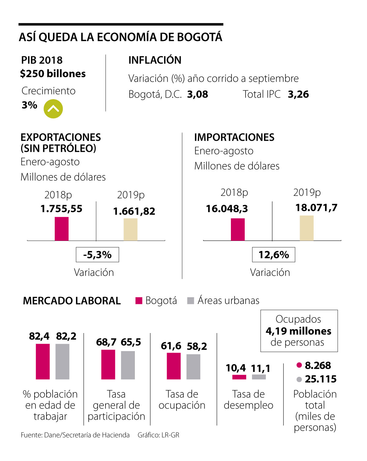 La nueva administración de Bogotá recibe una economía que logró un crecimiento de 3,5% en el primer trimestre del año, un balance por encima del Producto Interno Bruto (PIB) nacional, que creció 3,1% en este período. La capital, que en 2018 reportó un PIB de $250,58 billones, aporta 25,6% del PIB nacional, por lo que el nuevo alcalde no solamente tendrá a su cargo mantener una ciudad con más de 8,26 millones de personas, sino que también será responsable de un cuarto de la economía colombiana.