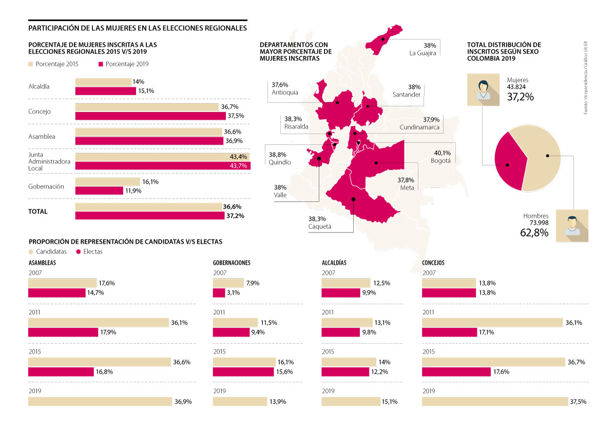 En las últimas elecciones territoriales de 2015, las mujeres alcanzaron 15,6% de las gobernaciones; 12% de las alcaldías; 16% de las asambleas departamentales y 17% de los concejos municipales.