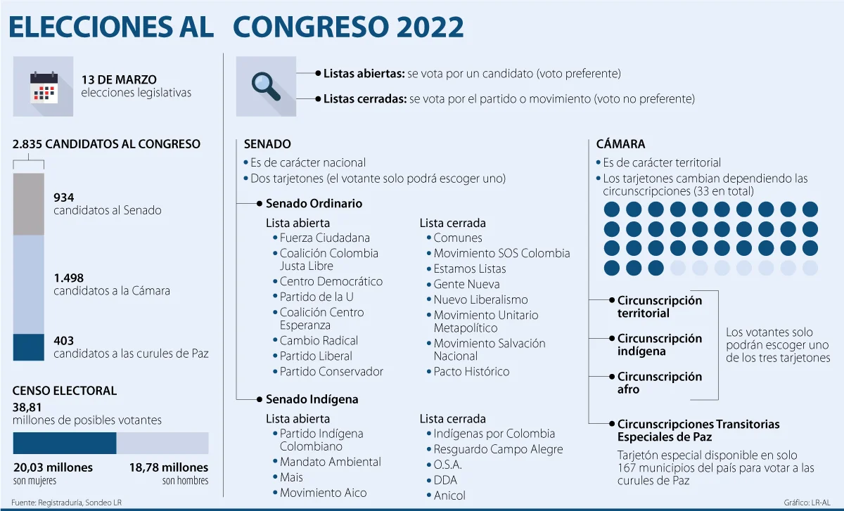 Tanto para Senado como para Cámara funcionan los modelos de listas abiertas (con voto preferente) o listas cerradas (con voto no preferente). Esto se traduce, principalmente, en las fichas electorales, pues hay partidos que dejan que los ciudadanos elijan a algunos candidatos en particular por medio de números que, en el Senado, van del uno al 100. Estos son los casos de las listas abiertas, es decir, que el elector vota por un candidato. En estas elecciones, entre los partidos de listas abiertas destacan el Liberal, el Centro Democrático, el Partido Conservador, Cambio Radical y el Partido de la U, entre otros.