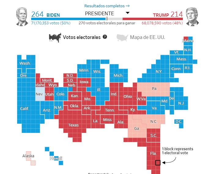Hasta el momento, según los últimos resultados, Biden sumaría 264 votos electorales mientras que el magnate Trump llevaría 214 votos.