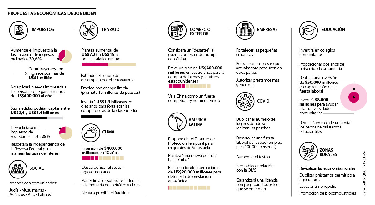 Bajo este panorama, el plan económico del potencial mandatario número 46 de la economía más grande del mundo se centra en 10 aspectos: subir impuestos a sociedades y clase alta, la recuperación y creación de empleos, desarrollo de la clase media, transición a energías renovables, bajarle el tono a la guerra comercial con China, hacerle frente al covid, recuperar Obamacare, fortalecer las pequeñas empresas, apostar por las universidades comunitarias y la reapertura gradual.