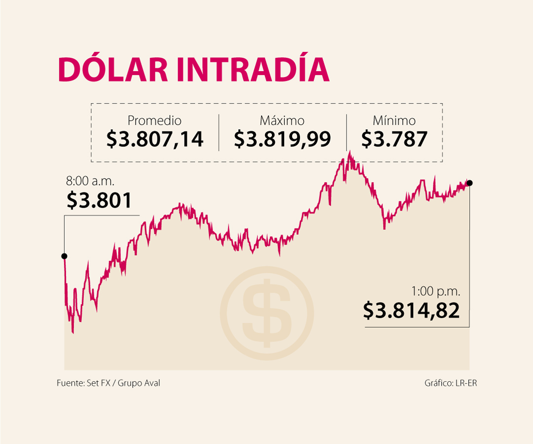 La divisa estadounidense abrió la jornada con un precio de $3.801 y su cierre fue de $3.814,82. El precio mínimo que se registró fue de $3.787, mientras que el máximo fue $3.819,99. El monto negociado durante la jornada fue de US$907,97 millones en 1.311 transacciones.