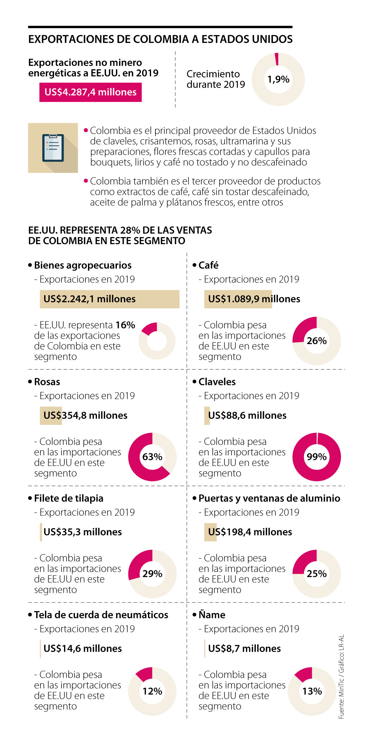 Si miramos cuáles son los productos que más se venden a Estados Unidos, el top 3 está en las flores, el café y productos agrícolas (frutas y agregados). El producto colombiano con mayor exportaciones a EE.UU. son las flores, Augusto Solano, presidente de Asocolflores dijo que “Estados Unidos es de lejos el mercado más importante, Colombia exporta 97% de sus flores y 80% va para allá, nos preocupa la economía por la generación de empleo, Trump supo manejar la economía en pandemia, no sabemos cómo lo hagan los demás”.