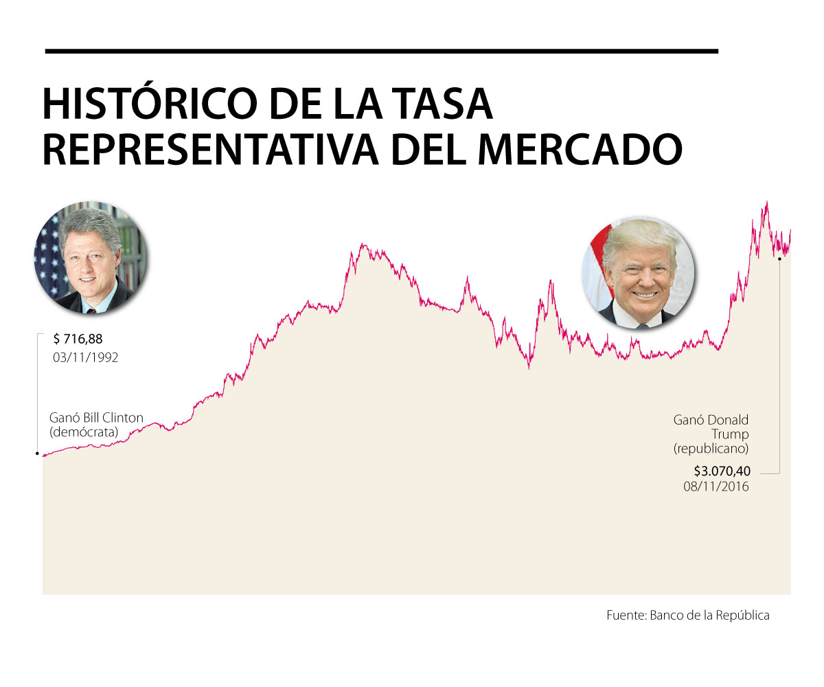 Una fue cuando ganó Donald Trump en 2016, pues el precio promedio del dólar registró un alza de $27,34 con relación a la TRM, y la otra fue después de la victoria de Clinton en 1992, ya que el precio promedio de cotización de la divisa aumentó $0,23 frente a la TRM.