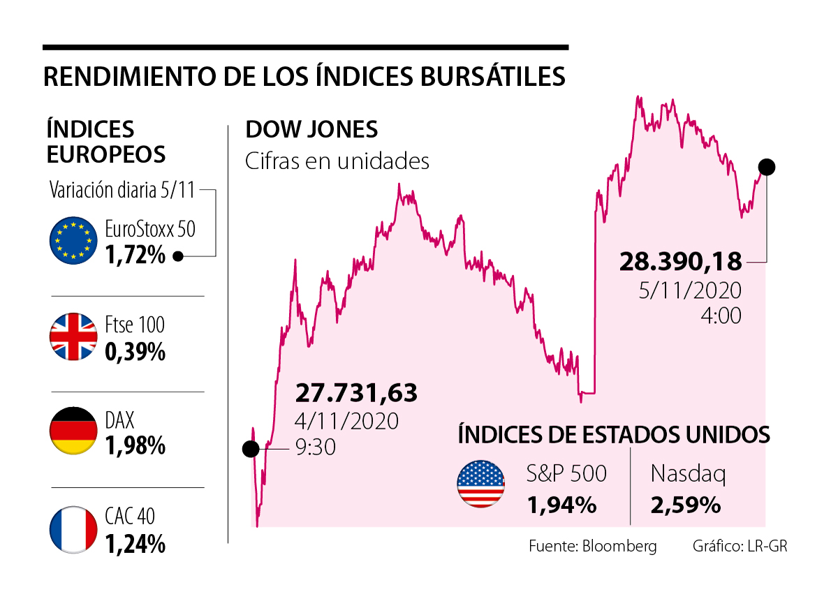 El S&P 500 saltó más de 1,9% por cuarto día consecutivo y se dirige a la mejor semana desde abril. El Nasdaq 100, con las acciones de tecnología, subió más de 2,5%, impulsando su avance esta semana alrededor de 9%. El conteo de votos continuaba en cuatro estados, y el demócrata Joe Biden necesitaba ganar solo en uno para derrotar al presidente Donald Trump. Aún se espera que los republicanos mantengan el control del Senado.