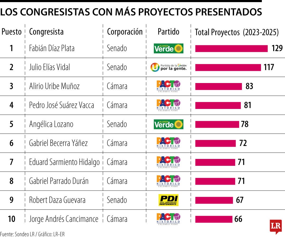 El senador Fabián Díaz Plata, de la Alianza Verde, encabeza el listado general con 129 proyectos de ley en los que figura como autor o coautor entre 2023 y 2025. El congresista santandereano ha participado activamente en iniciativas relacionadas con temas sociales, ambientales y de bienestar animal, así como en proyectos orientados a fortalecer la protección de derechos ciudadanos.