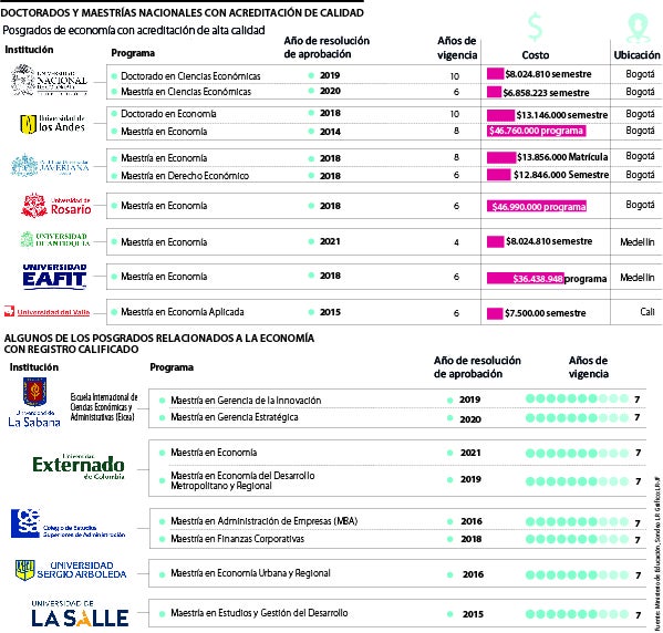 La Universidad Nacional de Colombia (Unal) tiene dos posgrados de este campo de estudios con Alta Calidad. Está la Maestría en Ciencias Económicas y el Doctorado en Ciencias Económicas. El director del área curricular y docente de la Facultad de Ciencias Económicas de la universidad, Diego Guevara, explicó que una de las principales fortalezas de la maestría es que tiene un precio competitivo dentro del mercado, “prácticamente el costo es la mitad de las demás instituciones que ofrecen la maestría”.