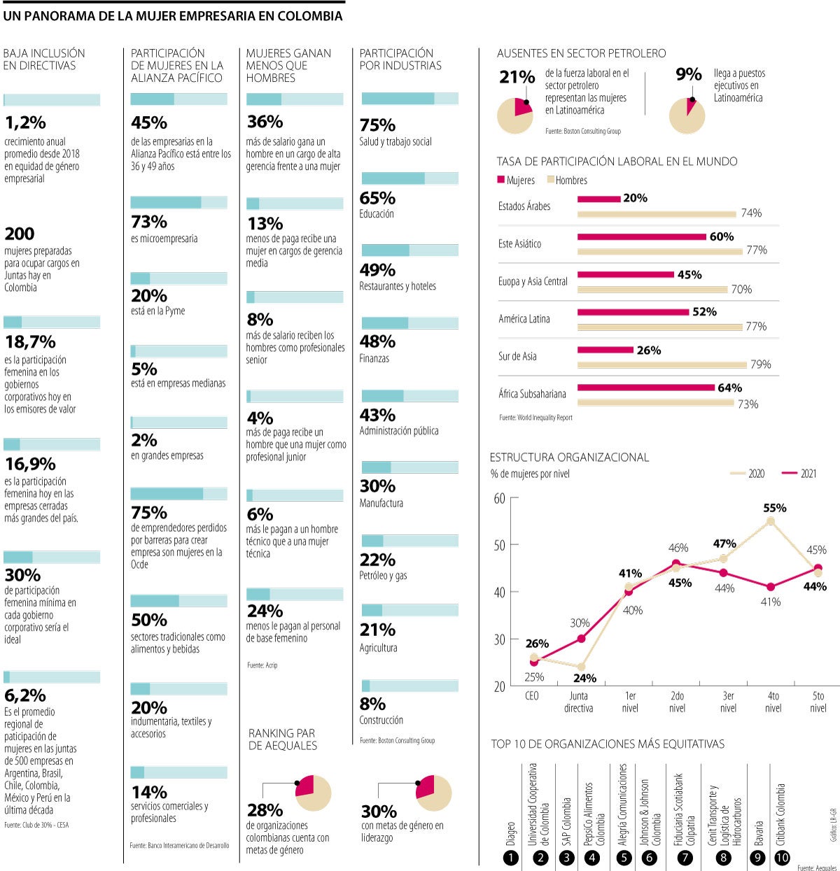 La firma Aequales reveló que en Colombia solo 28% de empresas tiene hoy metas de género, según un estudio entre 356 organizaciones. También revela que el porcentaje de mujeres que llegan al cargo de CEO fue apenas de 25% en 2021, un punto porcentual menos que en 2020. “Si hacemos un análisis de las organizaciones que cuentan con acciones para el cierre de la brecha salarial, vemos que seguimos por debajo de la media regional”, dijo María Paulina del Castillo, gerente comercial de Aequales. Encontraron que solo 46% de las organizaciones que se midieron en el país, tiene una política de igualdad salarial.