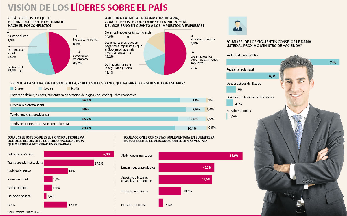 Por otro lado, la encuesta también trató temas como el posconflicto, ante la pregunta sobre cuál creían que era el principal frente de trabajo hacia el posconflicto, para 45,3% sería la generación de empleo, seguido por el sector rural (29,5%) y la desigualdad social (22,9%).
