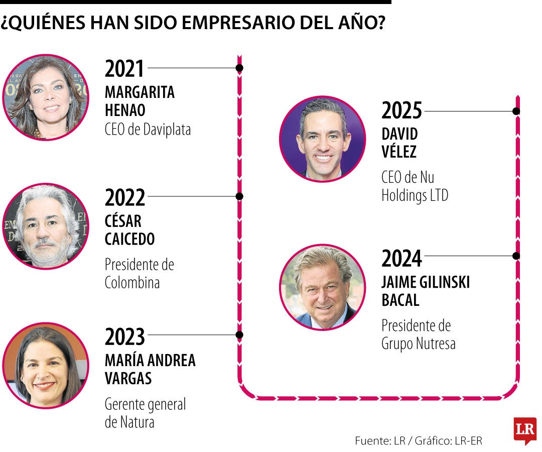 ¿Quiénes tuvieron este reconocimiento en las versiones pasadas? Los últimos siete empresarios destacados fueron Jaime Gilinski, presidente de Nutresa (2024); María Andrea Vargas, gerente general de Natura (2023); César Caicedo, presidente de Colombina (2022); Margarita Henao, presidenta de Daviplata (2021); Felipe Bayón, presidente de Ecopetrol (2019); Simón Borrero, CEO de Rappi (2018) y Álvaro Pimentel, presidente de Itaú Colombia (2017).