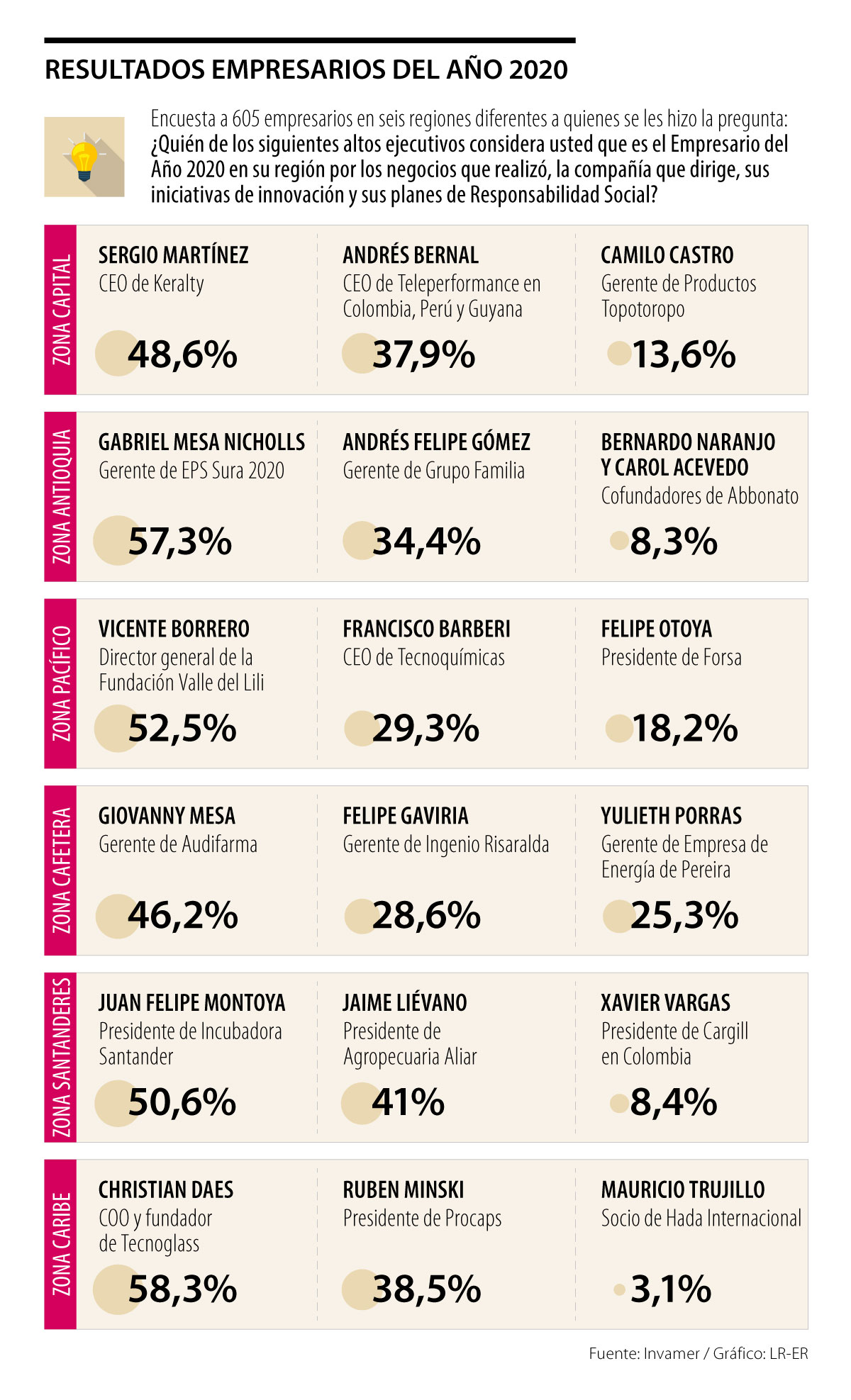 De menor a mayor, posteriormente, en la Zona Santanderes, el presidente de Incubadora Santander, propietaria de la marca Huevos Kikes, Juan Felipe Montoya, quedó con 50,6% de las encuestas, a este le siguió el director general de la Fundación Valle del Lili, Vicente Borrero, quien obtuvo 52,5% de votos. Los empresarios que obtuvieron mayor apoyo dentro de los ejecutivos encuestados en sus regiones fueron, el gerente de EPS Sura hasta enero de 2021, Gabriel Mesa Nicholls, pues recibió 57,3% de respaldo de sus pares en la Zona Antioquia, y el COO de Tecnoglass, Christian Daes, pues en la Zona Caribe, 58,3% de los líderes exaltaron su labor.