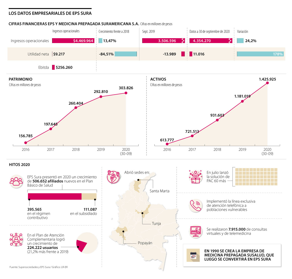 En materia de cifras, EPS Sura presentó en 2020 un crecimiento de 506.652 afiliados nuevos en el Plan Básico de Salud (395.565 en el régimen contributivo y 111.087 en el subsidiado). Además, en el Plan de Atención Complementaria logró un crecimiento de 224.222 usuarios (21,2% más frente a 2019).