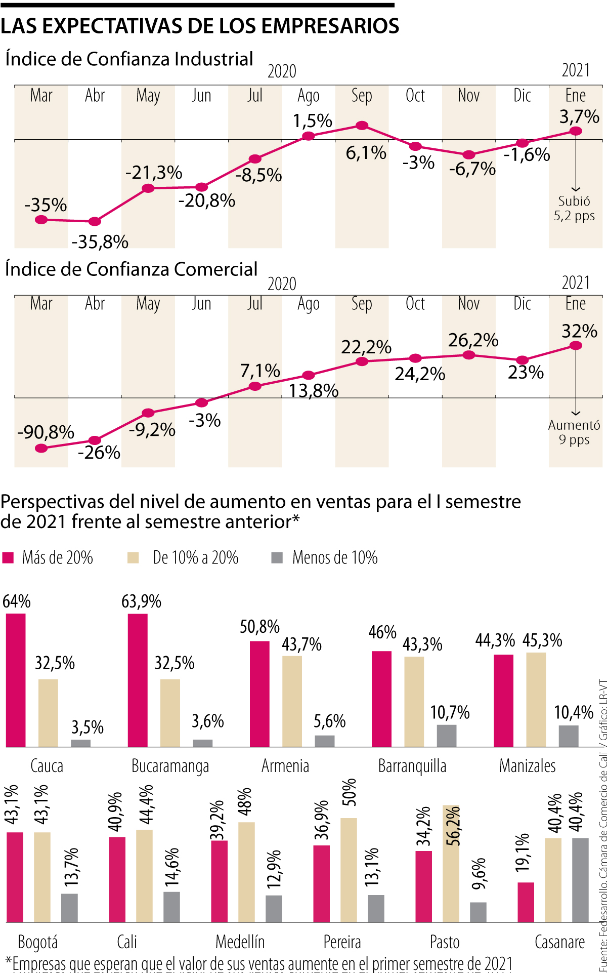 Entre las empresas afiliadas a las cámaras de comercio de las ciudades capitales, en Cauca (64%), Bucaramanga (63,9%) y Armenia (50,8%) se registraron las proporciones más altas de empresas con perspectivas de aumento en sus ventas de más de 20% para el primer semestre de 2021, respecto al segundo semestre del año pasado.