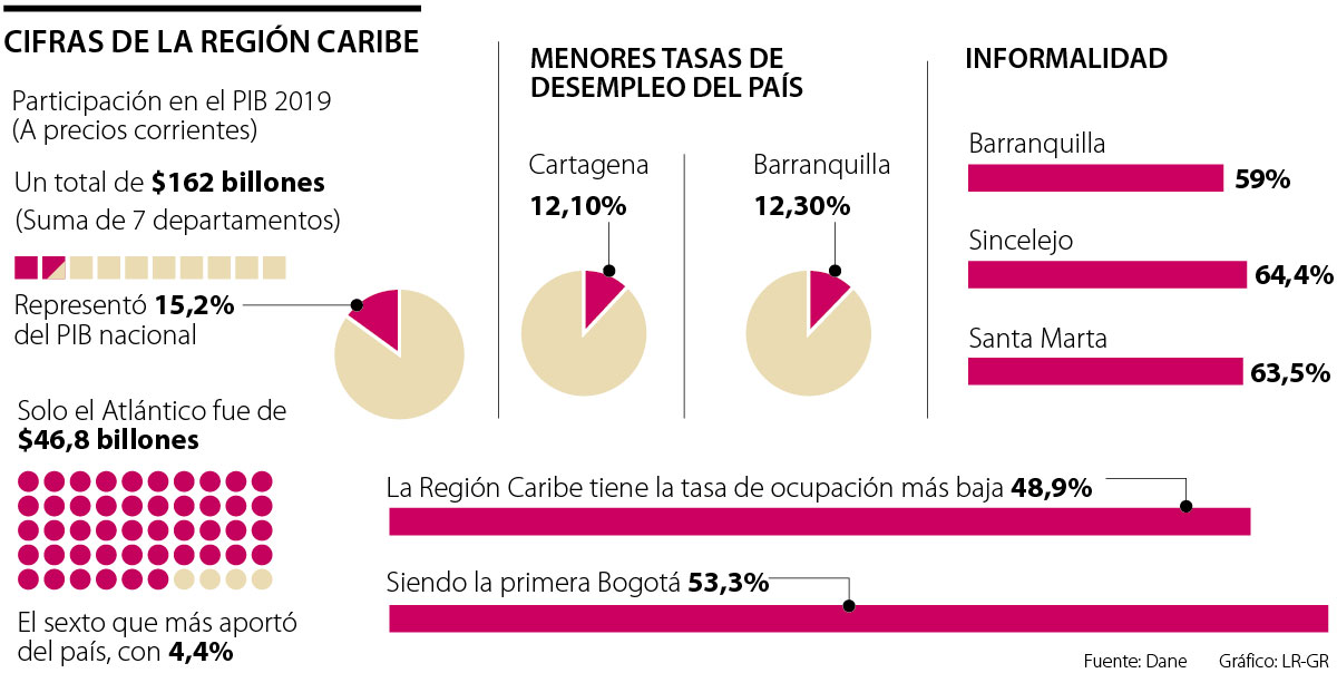 En 2019, El PIB de la Región Caribe, incluidos los siete departamentos que la conforman, estuvo valorado en $162 billones y representó 15,2% del total nacional en el periodo.