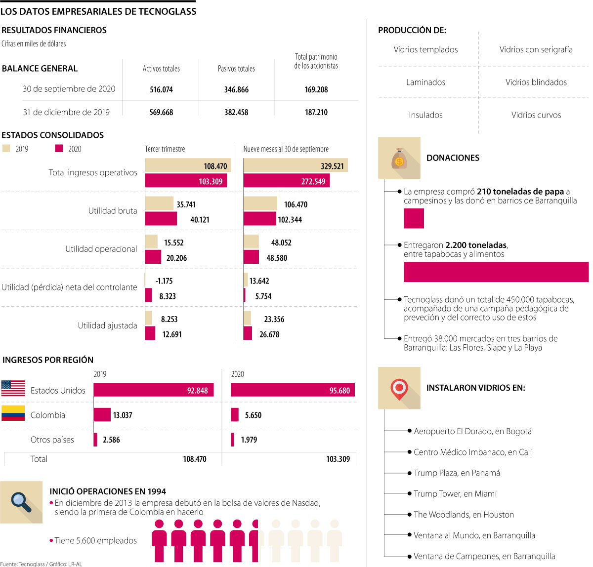 En el tercer trimestre de 2020, Tecnoglass obtuvo ingresos de US$103,3 millones en comparación con US$108,5 millones en el mismo trimestre del año anterior. Las ventas en Estados Unidos llegaron a US$95,7 millones, que representan 93% del total de ventas, y crecieron 3% comparado con US$92,8 millones en el mismo trimestre de 2019.