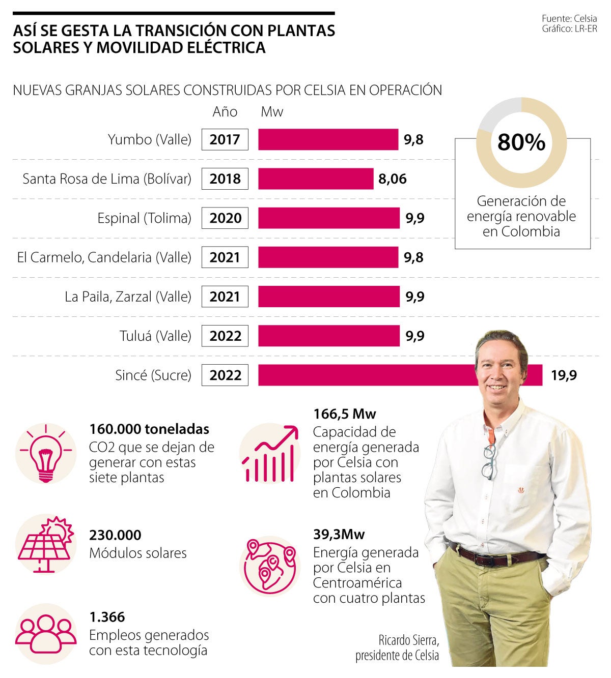 Hace seis años Celsia construyó la primera granja solar a gran escala, de 9,8 MW y 35.000 paneles solares. Esta planta en Yumbo (Valle) es el resultado de pruebas que se venían realizando desde 2014. Tras la primera planta a gran escala de energía fotovoltáica en Yumbo entraron en operación seis más, entre 2018 y 2022, en Santa Rosa (Bolívar), Espinal (Tolima), Sincé (Sucre), El Carmelo, La Paila y Tuluá (Valle del Cauca). En total, la compañía cuenta con 14 plantas solares (cinco están por entrar en operación comercial) que suman una capacidad de 166,5 Mw y cuatro en Centroamérica, con una capacidad de generar 39,3 Mw.
