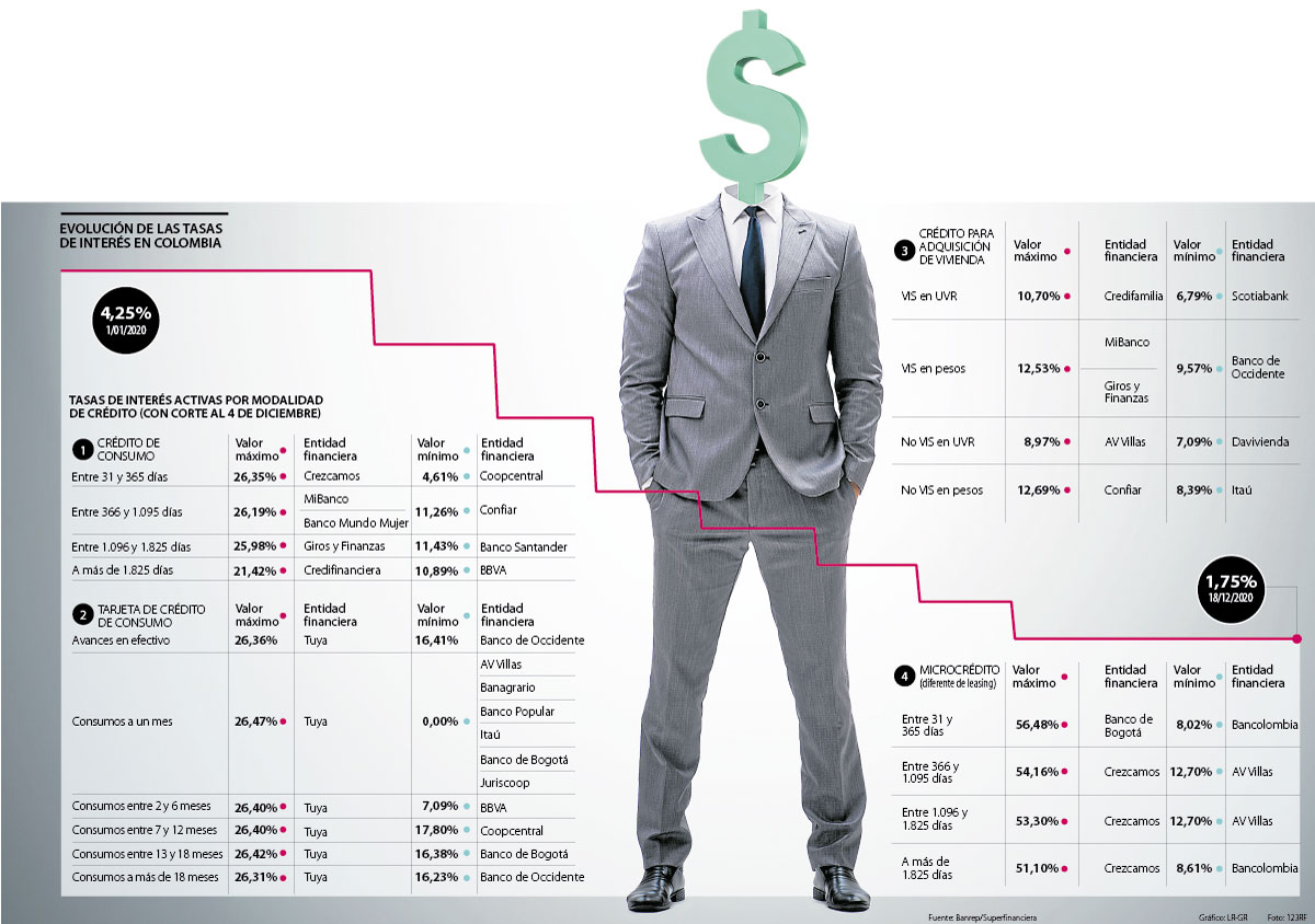 Según datos de Asobancaria, las tasas de las tarjetas de crédito para personas naturales bajaron alrededor de 180 PB entre la última semana de febrero y la primera semana de diciembre hasta bordear un nivel de 23,93%, mientras que las tasas de consumo se redujeron en cerca de 90 PB en el mismo periodo, con lo cual se ubicaron en 14,11%.