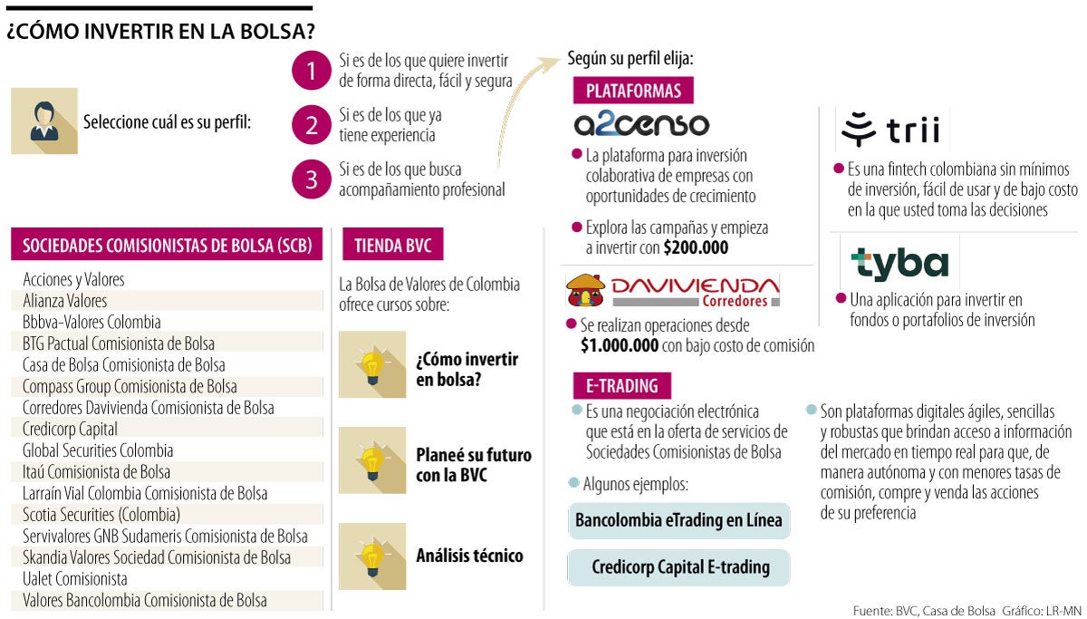 La mayor parte de los colombianos tienen la idea de que para invertir en la Bolsa de Valores de Colombia (BVC) se necesita un alto músculo financiero o, mejor, un capital de largo aliento, pero la realidad es otra, especialmente desde que el mercado comenzó a ser más inclusivo o democrático, en parte por el alza en el número de entidades financieras y del portafolio de productos, lo que permite hoy adquirir una acción con una cantidad no tan alta, como se piensa, y en proyectos prometedores.
