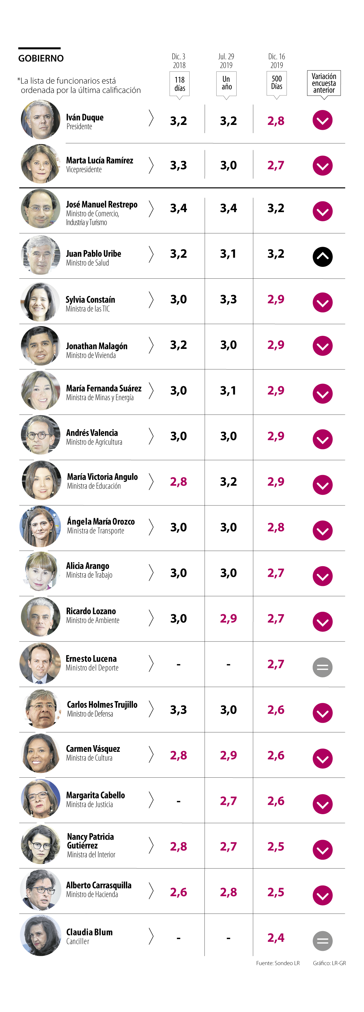Este pesimismo generalizado no solo ha permeado la imagen del presidente Iván Duque, que está en mínimos de desaprobación (70%) desde que llegó a la Casa de Nariño, sino que también ha afectado a la opinión que se tiene de sus funcionarios. Ello se refleja en que dos de los ministros sobre los que pregunta Gallup, Carlos Holmes Trujillo, quien pasó de la Cancillería a la cartera de Defensa, como Alberto Carrasquilla de Hacienda, empeoraron su imagen respecto a octubre.