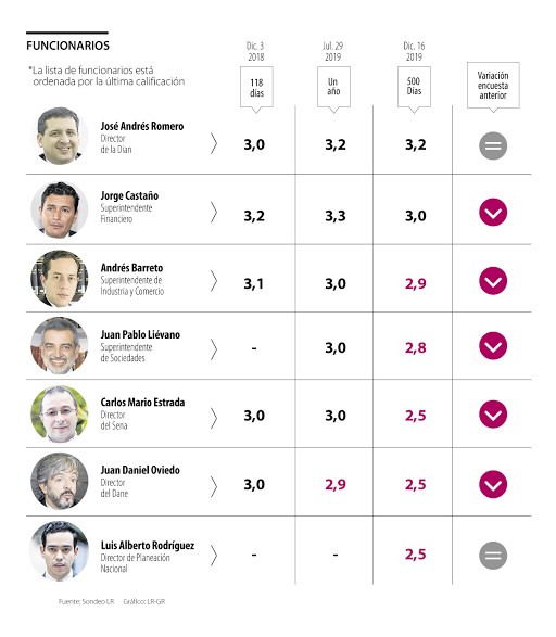 Juan Daniel Oviedo, director del Dane, fue quien mostró la mayor caída en su calificación, pues pasó de 3,0 en diciembre del año pasado a 2,9 en julio y 2,5 este año. A Oviedo no le pasan la poca claridad que ha tenido la entidad en la metodología que está usando en sus mediciones. Además, le han criticado los aplazamientos en la entrega de datos clave.