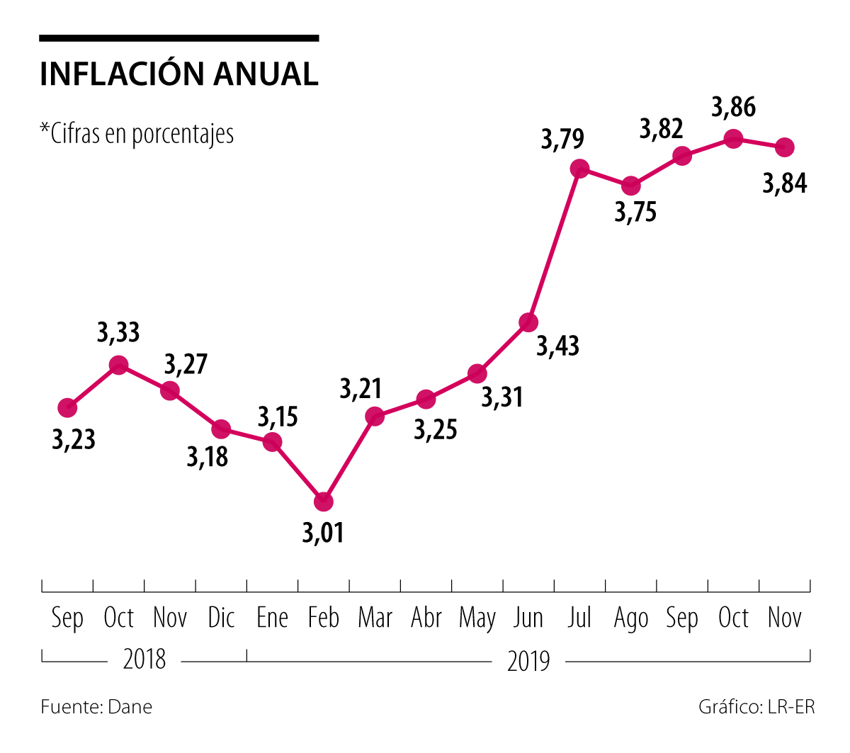 A pesar de mantenerse dentro del rango entre 2% y 4% que tiene definido el Banco de la República, en lo que va de 2019 la inflación ha venido incrementándose hasta rozar el techo de este margen. Si bien en noviembre el dato se corrigió a la baja y la inflación anual se ubicó en 3,84%, el incremento de los precios, especialmente impulsado por los alimentos, se ha sostenido a lo largo del año. El Emisor proyecta que la variación del IPC cerrará 2019 en 3,88%, sin embargo, considera que convergerá a la meta de 3% en los próximos meses. Recientemente, el gerente del Banco, Juan José Echavarría, dijo que la tasa de cambio y las manifestaciones podrían generar incertidumbre.