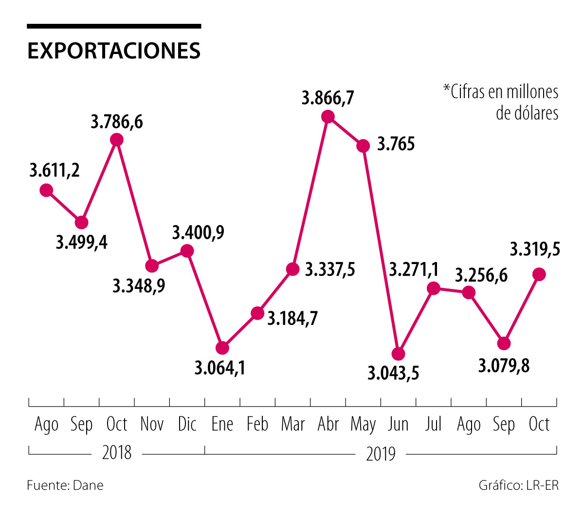 Aunque la tasa de cambio ha alcanzado niveles históricos, este factor no ha ayudado a mantener creciente el saldo de las exportaciones, que desde junio registran caídas superiores a 8% cada mes. “No ha sido un buen periodo. El año pasado terminamos con unas exportaciones alrededor de $42.000 millones y la idea era llegar en este año a $47.000 millones, y eso no lo vamos a lograr, incluso vamos a estar por debajo de $42.000 millones”, aseguró Javier Díaz, presidente de Analdex, el gremio de los exportadores. Díaz aseguró que esto se debe a múltiples factores, como una menor demanda mundial, particularmente de la economía china, como resultado de la guerra comercial.
