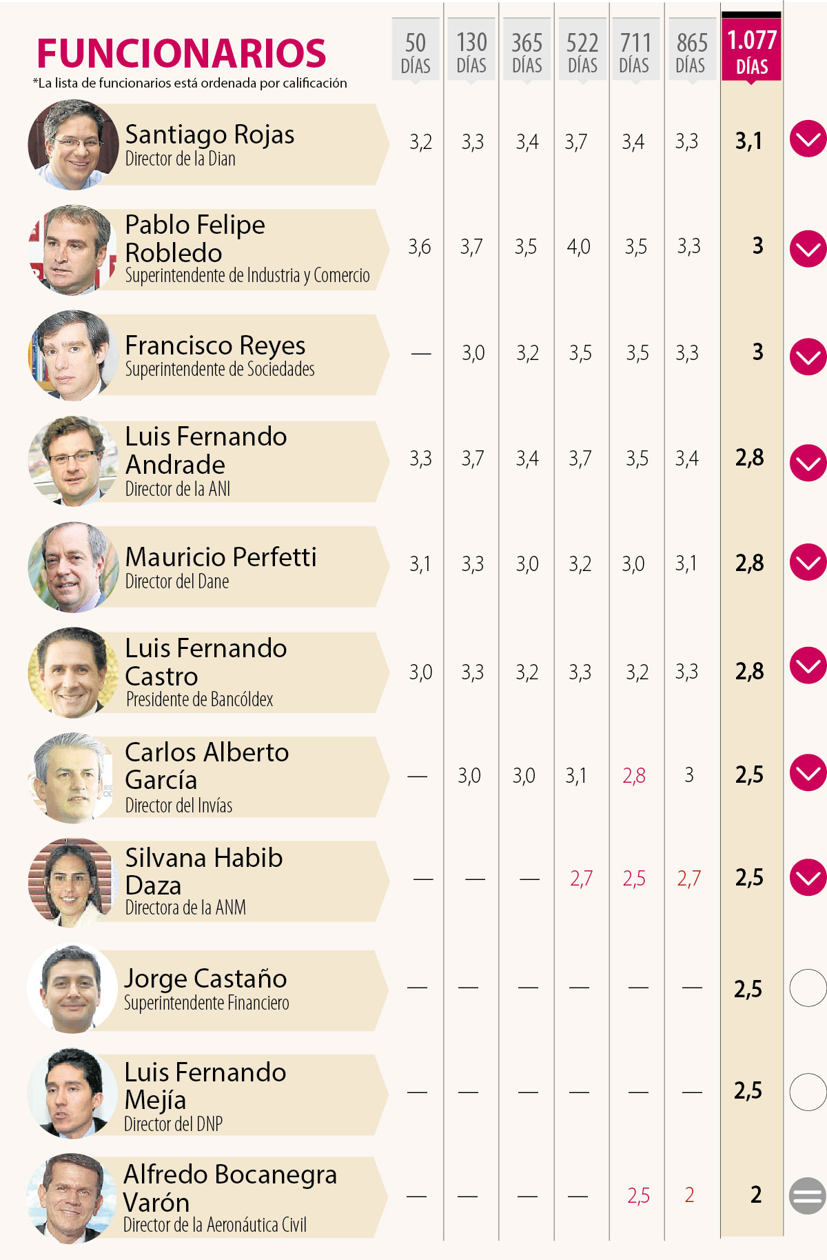 Por su parte, Luis Fernando Castro, presidente de Bancóldex, quien tuvo una nota de 2,8, se vería afectado por el bajo reconocimiento y, según Botero, por “las líneas de redescuento a precios altos que no favorecen a los empresarios”.