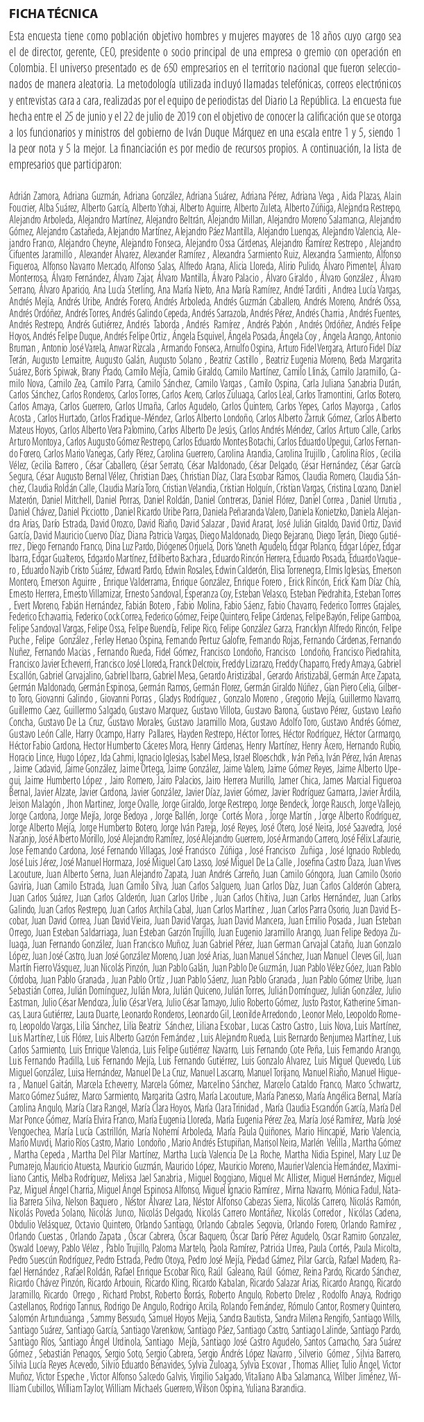 En el tercer lugar, con una calificación de 3,0, hay un cuádruple empate: los superintendentes de Sociedades e Industria (Juan Pablo Liévano y Andrés Barreto), el director del Sena (Carlos Mario Estrada) y la directora del Departamento Nacional de Planeación (Gloria Alonso).