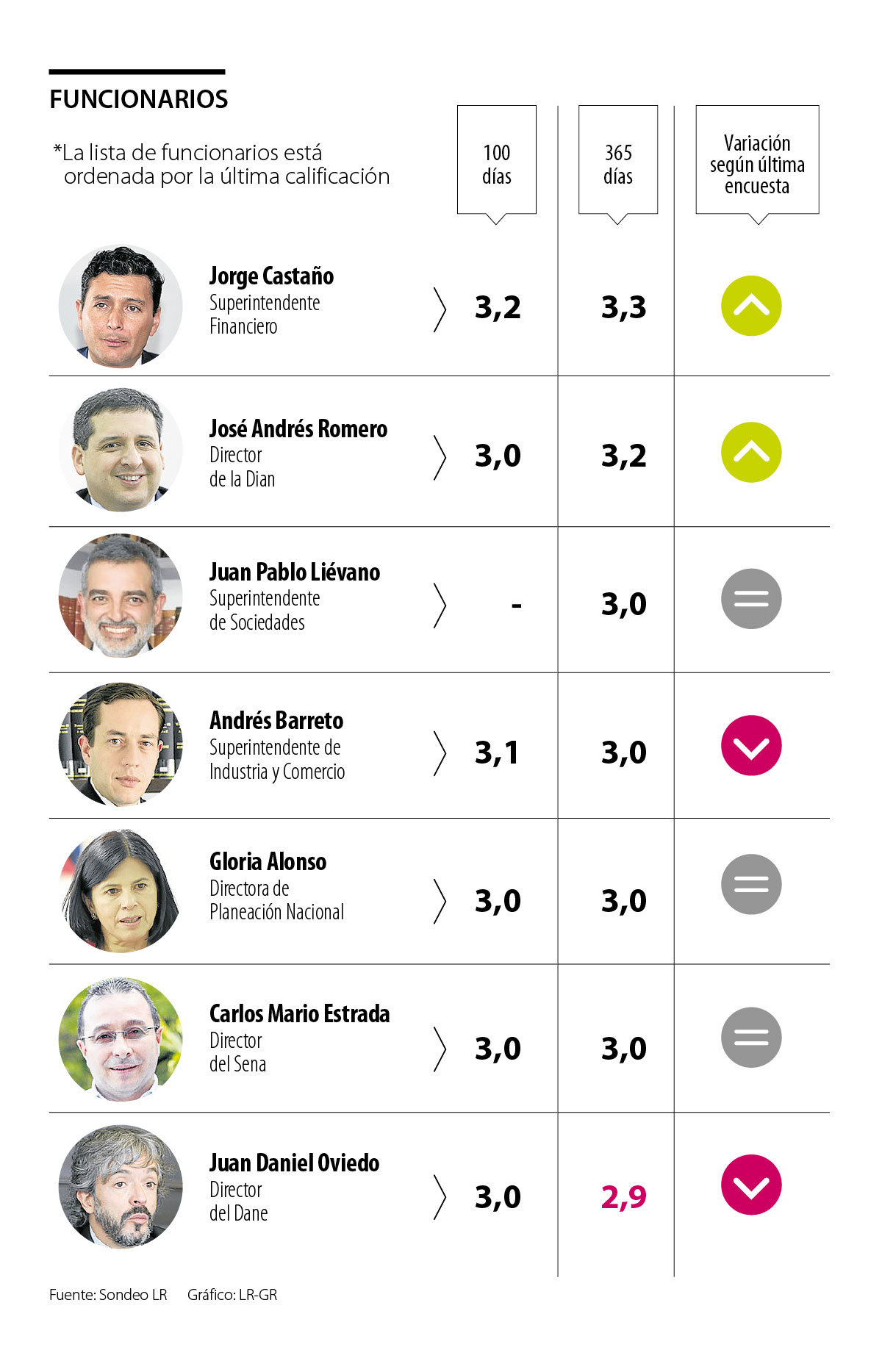 Entre los funcionarios, el mejor calificado fue por segunda vez el superintendente financiero, Jorge Castaño, con una puntuación de 3,3. Los empresarios le reconocen a Castaño su experiencia y valoran la continuidad en el puesto.