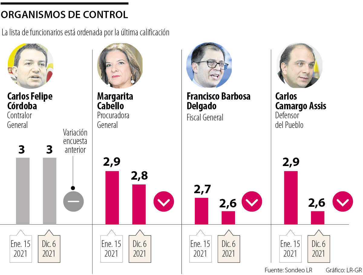 Como cada semestre, LR realizó una encuesta a los líderes empresariales del país sobre su percepción de los funcionarios públicos del periodo presidencial en curso. Durante el primer semestre de 2021, por primera vez, se incluyó en el sondeo a los organismos de control o a las conocidas “ías”. Estas son: la Contraloría General de la República, la Fiscalía General de la Nación, la Procuraduría General de la Nación y la Defensoría del Pueblo.