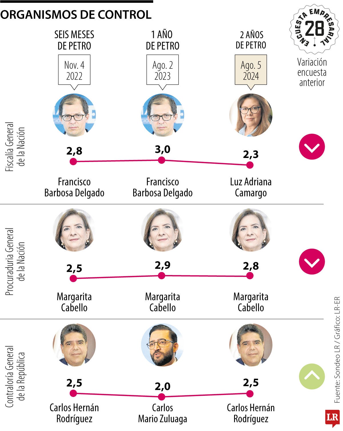 En la edición XXVIII de la Calificación de Funcionarios elaborada por LR, las entidades de control no obtuvieron una buena nota por parte de los empresarios encuestados, pues la calificación más alta fue la de la Procuraduría que no alcanzó a llegar a las tres unidades.