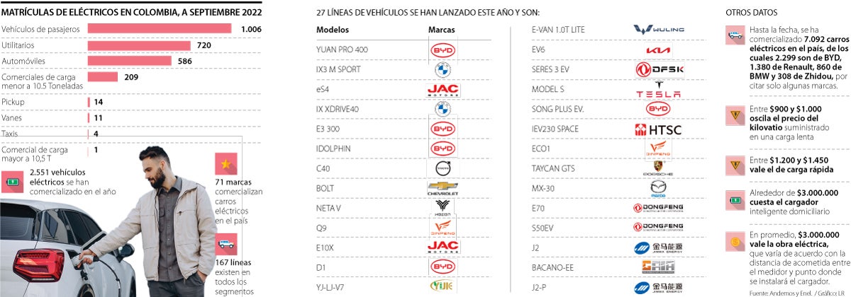 “Más de 70 marcas comercializan en el país este tipo de vehículos, para un total de 167 líneas con estas tecnologías, en todos los segmentos, entre ellas: Nissan (Leaf), Renault (con varios modelos como Zoe E-Tech), BYD (con Tang EV, siete pasajeros), BMW (con varias referencias como iX3), MINI (Cooper SE), Volvo (XC40 Recharge), Tesla (Model S) y JAC (E10X)”, dijo Oliverio García, presidente de Andemos.