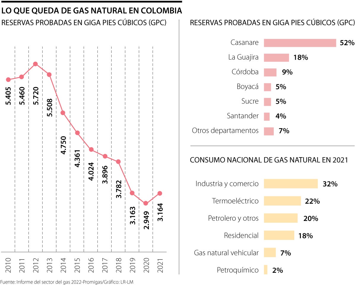Petro agregó: “No les voy a discutir que el gas no sea una fuente de energía de transición. Obvio que es mucho mejor que quemar leña. La pregunta es si es la mejor para el futuro”. De cara precisamente a ese futuro, Colombia cuenta con unas reservas de gas que podrían garantizar el suministro de hidrocarburos por seis a ocho años más. Acontecimientos como el descubrimiento, a mediados de este año, de un nuevo yacimiento en el mar Caribe, por parte de Ecopetrol y Petrobras, aumentan las reservas nacionales, que hasta 2020 tenían una tendencia a la baja.
