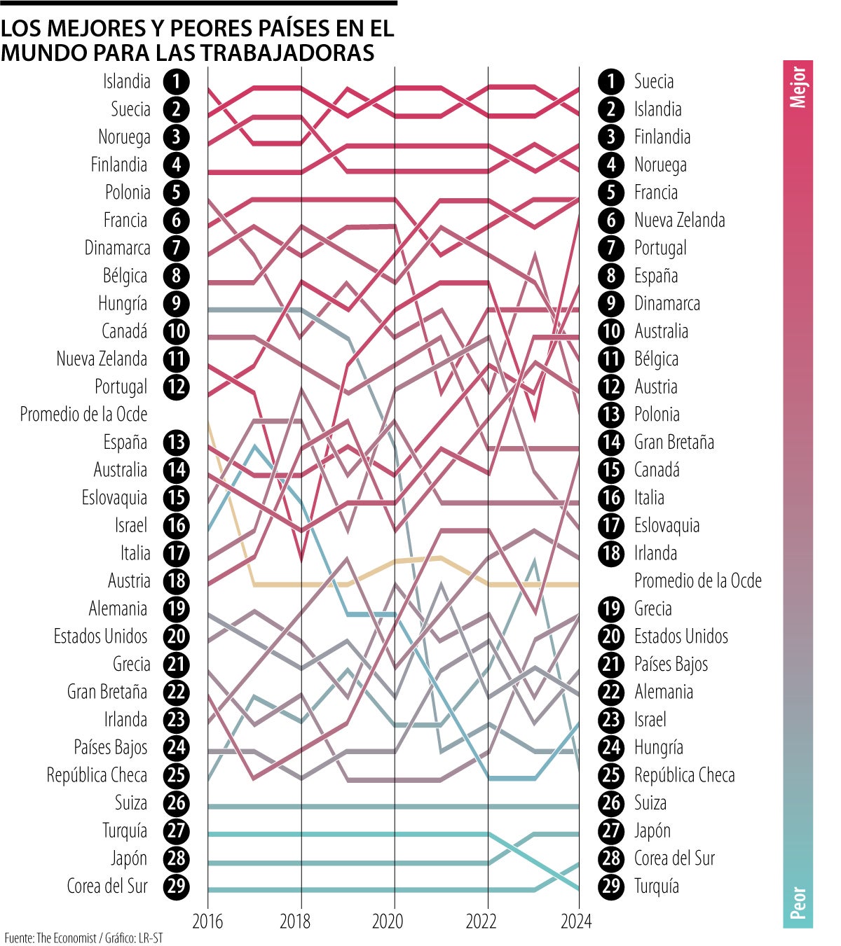 El índice mide desde la participación en la fuerza laboral y hasta la licencia parental remunerada y la representación política dentro de los países que pertenecen a la Organización para la Cooperación y el Desarrollo Económica, Ocde.
