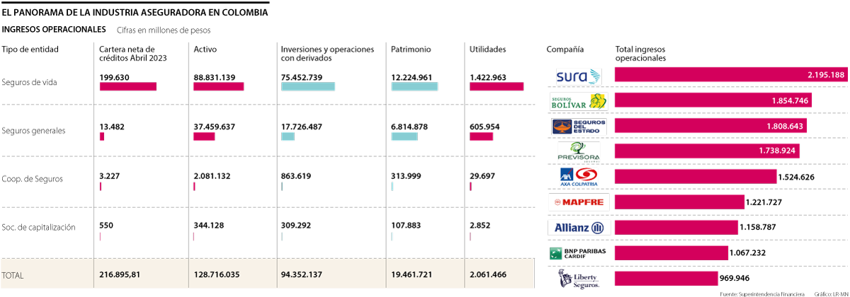 Sura, por ejemplo, reportó ingresos operacionales por $2,1 billones. Le siguen Bolívar, con $1,8 billones; Seguros del Estado, con $1,8 billones; La Previsora SA, con $1,7 billones y AXA Colpatria Seguros, que registró $1,5 billones.