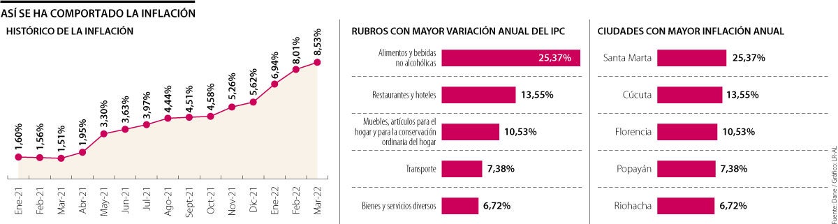 La inflación ha venido en un constante aumento desde mayo de 2021, cuando su variación anual fue de 3,3%. Desde entonces, ha venido mes tras mes subiendo, por cuenta de factores como la crisis de la logística internacional, el aumento de la demanda y ahora se suma la temporada invernal. En marzo, el Dane reveló que el costo de vida había llegado a 8,53% en su dato anualizado, explicado especialmente por alimentos, cuya inflación fue de 25,3% para este mes.