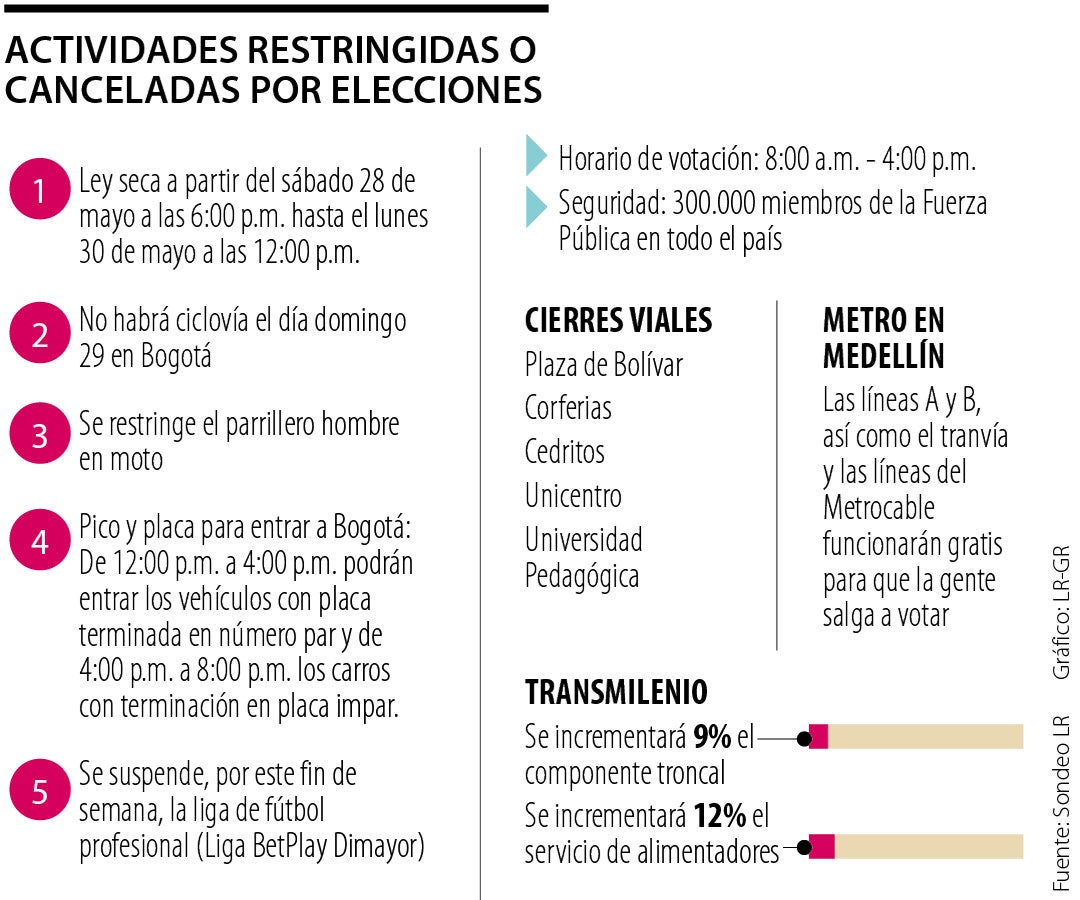 Hoy, los colombianos acudirán a las urnas para escoger al próximo presidente de la República. Como cada cuatro años, diferentes actividades estarán suspendidas en razón de los comicios. Además, habrá restricciones para garantizar que la jornada electoral se desarrolle con normalidad, una tarea en manos del ministerio de Defensa y del Interior.