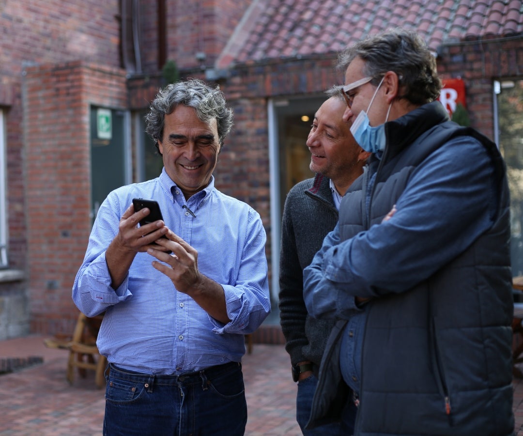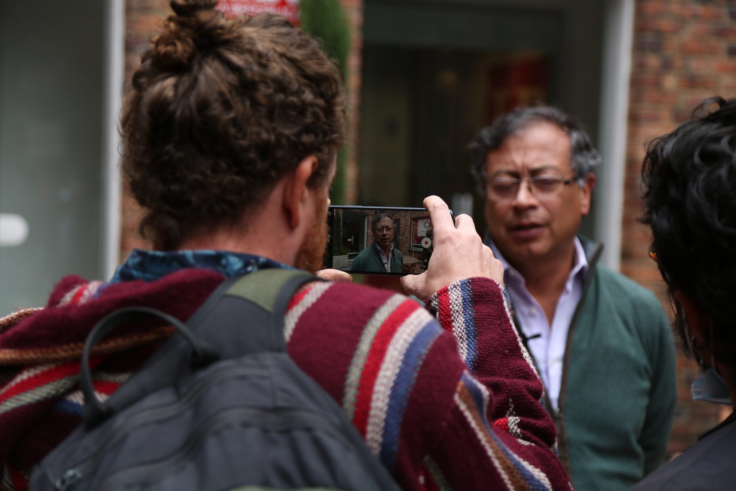 El candidato Gustavo Petro enviando un mensaje a sus seguidores en redes sociales antes de iniciar el conversatorio.