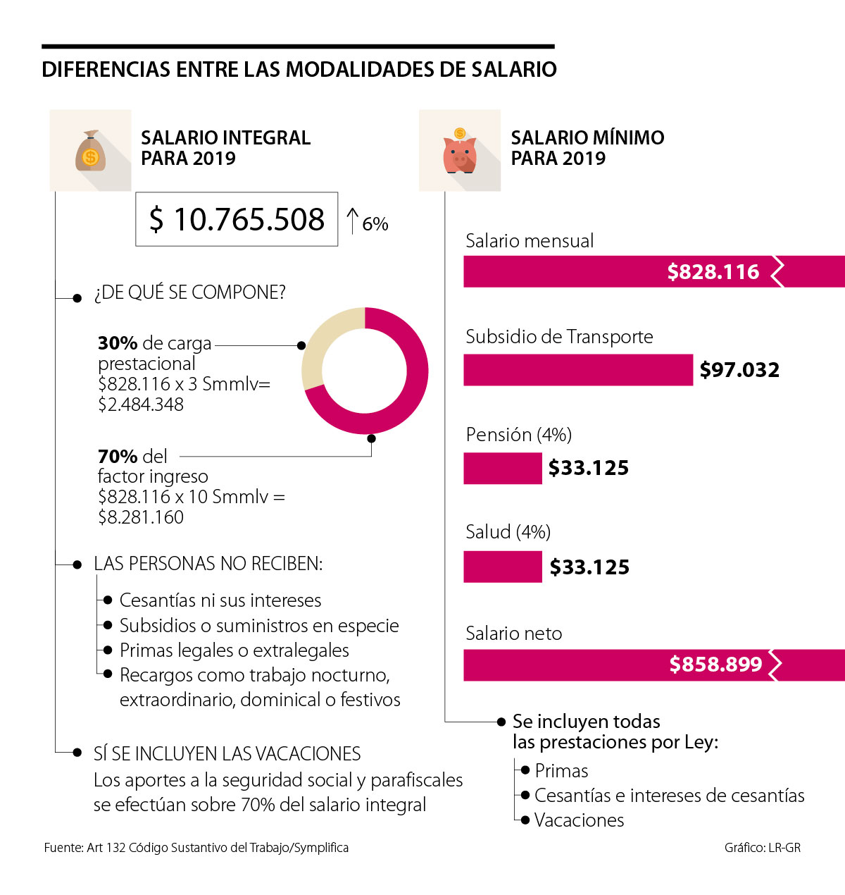 Integral: es el salario que retribuye el trabajo ordinario y compensa el valor de las prestaciones, los recargos y los beneficios. Su cuantía no puede ser menor a 10 salarios mínimos legales mensuales vigentes más el factor prestacional de la empresa que no puede encontrarse por debajo de 30% de la cuantía que se reconozco a título de remuneración. Esta modalidad de salario debe ser pactado expresamente por las partes.