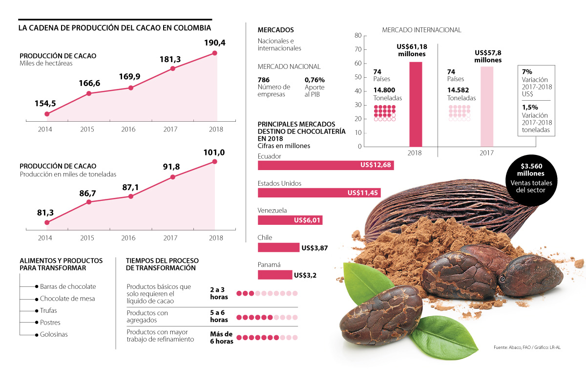 Hoy Colombia exporta chocolates, cocoa, licor de cacao, entre otros, a 74 países a miles de kilómetros de los cinco continentes; desde 15 departamentos como Antioquia, Valle del Cauca, Magdalena, Nariño, Risaralda, Tolima; gracias al trabajo de más de 25.800 personas de la industria. Este recorrido comienza en la zona rural de Colombia, con el cultivo y la extracción de las semillas de cacao, que se fermentan y luego se limpian, para ser transformadas y obtener los derivados a los que se le agregan ingredientes necesarios para llegar a los productos finales de chocolatería. Por ejemplo, el chocolate de mesa, en el que los colombianos gastaron a septiembre de 2019 $1,8 billones según Raddar.