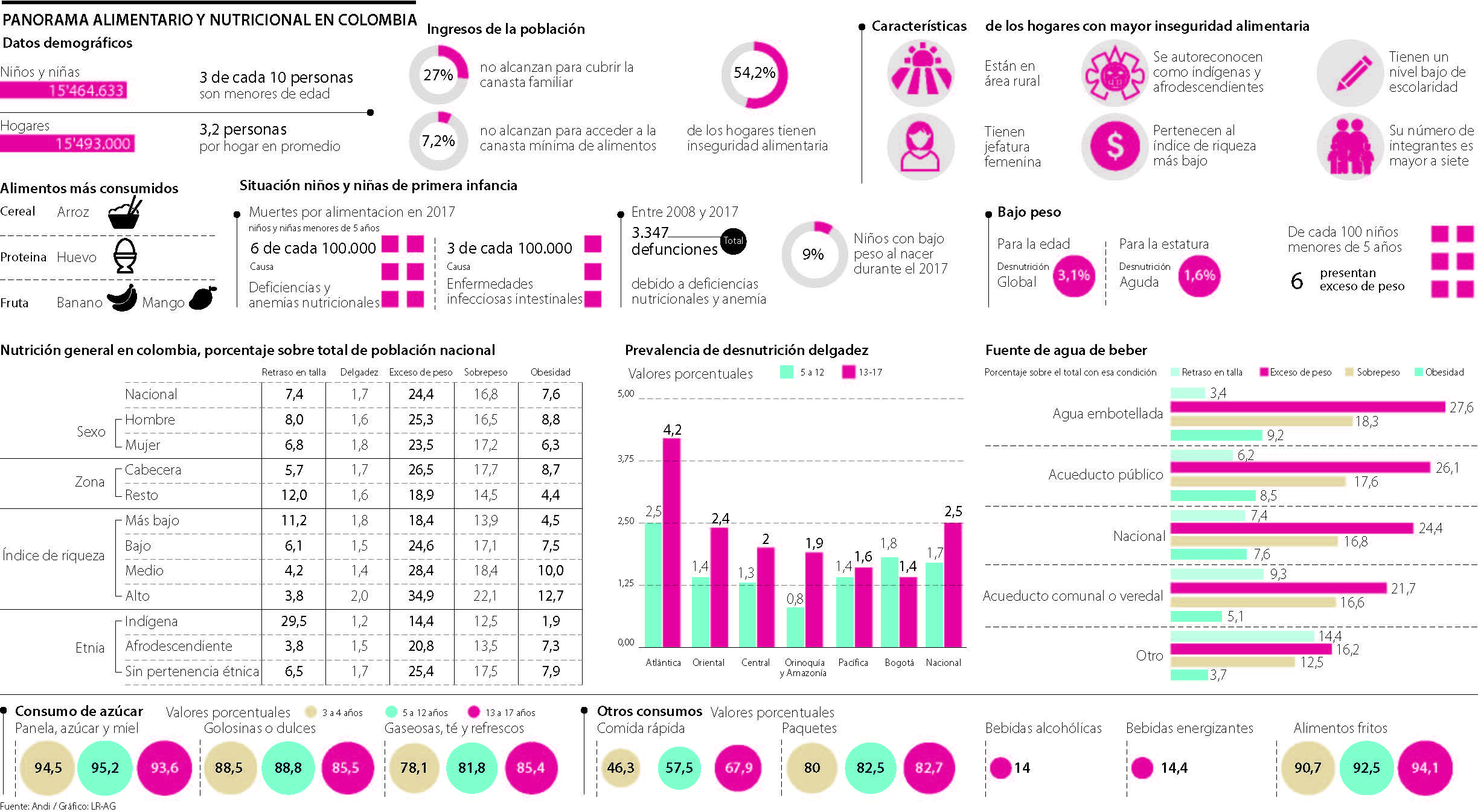 En Colombia hay 15,4 millones de hogares conformados en promedio por 3,2 personas; de este total, 27% no tienen ingresos para suplir los gastos totales de la canasta familiar, mientras que al 7,2% no le alcanza para acceder ni siquiera a la canasta básica. Lo anterior se ve reflejado en la inseguridad alimentaria presente en 54,2% de los hogares en el país.