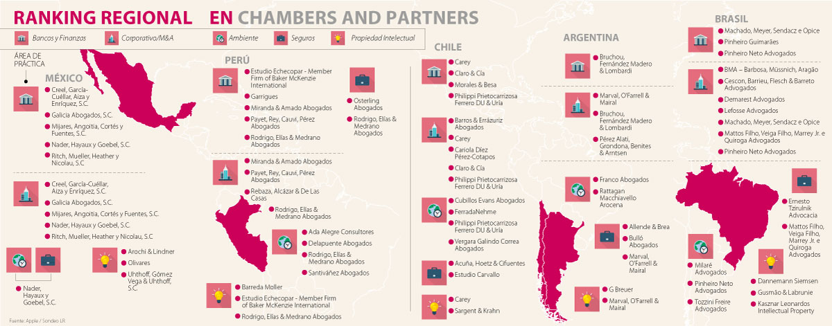 Con base en este ranking, LR consolidó la selección de las principales firmas de Argentina, Brasil, Chile, México y Perú en banda 1 de áreas de práctica estratégicas como banca y finanzas; corporativo y fusiones y adquisiciones; ambiente; seguros y propiedad intelectual.