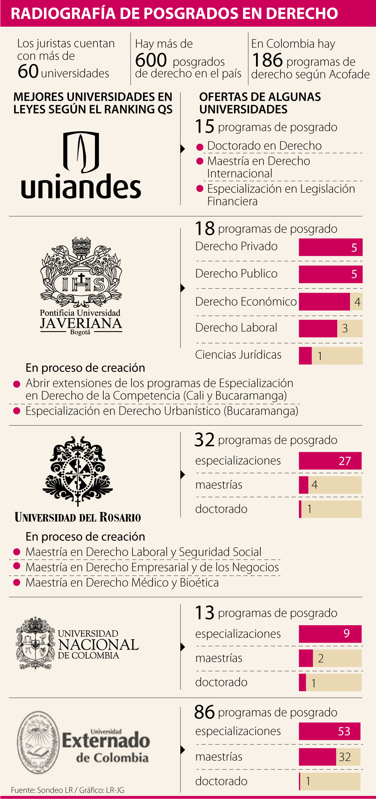 Las universidades entendieron esta nueva dinámica y es por eso que la oferta en posgrados en las diferentes ramas del derecho va en aumento. El Sistema Nacional de Información de la Educación Superior (Snies) reporta que en el país se ofrecen 614 posgrados en Derecho; 478 especializaciones, 112 maestrías y 24 doctorados.